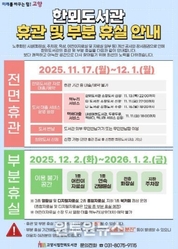 (원투원뉴스) 고양특례시 한뫼도서관은 공간 및 환경개선 공사 등을 위해 오는 11월 17일부터 12월 1일까지 15일간 임시 휴관한다고 밝혔다. 전체 공사는 부분 휴실을 포함해 내년 2월 준공을 목표로 진행될 예정이다. 이 사업은 경기도 특별조정교부금으로 추진되며, 주요 공사 내용은 △화장실 전면 리모델링 △주차장 환경 개선 △옥상 방수 △자료실 환경 개선 △승강기 교체 등으로, 노후화된 시설을 전면 정비해 이용자의 안전과 편의를 높이는 데 중점을 두었다. 2008년 3월 개관한 한뫼도서관은 개관 18년이 지난 도서관으로, 시설 노후로 인한 불편과 이용 만족도 저하 등 이용자 민원이 지속적으로 제기돼 왔다. 이번 공사를 통해 시민들이 보다 쾌적하고 안전한 환경에서 도서관을 이용할 수 있을 것으로 기대된다. 임시휴관 기간에는 자료 대출 및 예약, 도서택배서비스, 책누리(상호대차), 시설 이용, 대관 등 모든 서비스가 중단된다. 다만, 자료 반납은 도서관 외부에 설치된 무인반납기기 또는 무인반납함을 통해 가능하며, 희망도서 신청은 정상 운영돼 재개관 후 수령할 수 있다. 이영인 일산서구도서