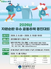 (원투원뉴스) 광주광역시 서구가 관내 100세대 이상 공동주택 204개소를 대상으로 ‘2026년 자원순환 우수 공동주택 경진대회’를 개최한다. 서구는 올바른 분리배출과 음식물쓰레기 감량 문화 정착을 위해 2013년부터 경진대회를 추진해 오고 있다. 서구는 올해 3월부터 10월까지 ▲음식물류 폐기물 감량실적(70점) ▲폐건전지·폐형광등 수거 실적(10점) ▲재활용품 분리배출 실태(10점) ▲자원순환 실천 주민 참여도(10점) 등을 종합적으로 평가해 오는 11월 우수 공동주택 10곳을 선정하고 총 2000만원의 포상금을 차등 지급할 계획이다. 참여를 희망하는 공동주택은 3월13일까지 서구청 누리집 공지사항의 관련 서류를 준비해 서구청 자원순환과에 방문하거나 전자우편 등으로 제출하면 된다. 서구는 3월 중 참여자 대상 사업설명회를 열어 경진대회 추진 절차와 실적 평가 기준 등 자원순환 실천 방안을 안내할 예정이다. 이판구 자원순환과장은 “자원순환 우수 공동주택 경진대회를 통해 주민 참여를 기반으로 자원순환 실천 문화가 지속적으로 확산될 수 있도록 노력하겠다”고 말했다. 한편 서구는 지난해 ‘