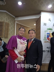 (원투원뉴스) 수원특례시의회 이재식 의장은 2월 11일(수) 오후 2시, 장안구 정자동 주교좌성당에서 열린 천주교 수원교구 곽진상 제르마노 주교 서품식에 참석해 신임 보좌주교의 서품을 축하했다. 이날 서품식에는 천주교 수원교구 신부단과 신도 등 약 2,000여 명이 참석해 곽진상 제르마노 주교의 새로운 사목 여정의 시작을 함께했다. 곽진상 제르마노 주교는 수원 출신으로 가톨릭대학교 신학과를 졸업하고 사제 서품을 받은 뒤, 파리 가톨릭대학교에서 교의신학 박사 학위를 취득했다. 이후 수원교구 법계 본당 주임신부, 수원가톨릭대학교 총장 등을 역임했으며, 2025년 12월 레오 14세 교황에 의해 수원교구 보좌주교로 임명됐다. 이재식 의장은 축하 인사를 통해 “곽진상 제르마노 주교님의 서품을 진심으로 축하드린다”며 “사목표어인 ‘그리스도 안에서 변화’를 통해 신앙 공동체는 물론 지역사회에도 깊은 울림과 희망을 전해주시길 기대한다”고 말했다. 이어 “수원특례시의회도 지역사회와 함께하는 종교·시민 공동체의 가치가 더욱 확산될 수 있도록 응원하겠다”고 밝혔다. 한편, 이날 행사는 미사와 축하식, 축하연 순으로