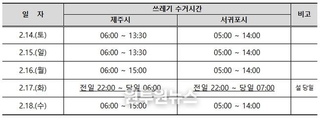 (원투원뉴스) 제주특별자치도는 설 연휴 기간 급증하는 생활폐기물을 원활하게 처리하고 도민 불편을 최소화하기 위해 ‘설 연휴 생활폐기물 처리 종합대책’을 추진한다. 우선 2월 2일부터 13일까지 청소 차량 311대와 음식물류 폐기물 종량기(RFID) 5,809대에 대한 사전 점검을 완료해 연휴 기간 쓰레기 처리에 차질이 없도록 준비를 하고 있다. 제주도는 연휴 기간(14~18일)에 쓰레기 수거를 강화할 예정이다. 쓰레기 배출이 집중되는 명절 전날인 16일에는 2회 수거(오전 5시~오후 3시, 오후 10시~다음날 오전 6시)를 실시해 생활폐기물 증가에 총력을 다해 대응할 방침이다. 이와 함께 제주도는 연휴 기간 중 발생하는 쓰레기 관련 생활 민원에 신속히 대처하기 위해 ‘생활쓰레기 처리 종합상황실’도 운영한다. 임홍철 제주도 기후환경국장은 “설 연휴에도 쓰레기 처리와 관련한 불편을 최소화하고 깨끗한 환경을 유지하기 위해 최선을 다하겠다”며 “쓰레기 줄이기와 올바른 분리배출 등 도민 여러분의 적극적인 협조를 당부드린다”고 밝혔다.
