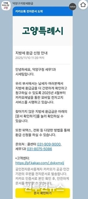 (원투원뉴스) 고양특례시 덕양구는 11월 한 달 동안 납세자가 찾아가지 않은 지방세 미환급금을 돌려주기 위해 ‘지방세 미환급금 집중 기간’을 운영한다고 6일 밝혔다. 덕양구의 2025년 하반기 미환급금 정리 대상은 총 6,858건, 2억 3,736만 원이다. 구는 납세자의 권리보호를 위해 카카오 알림톡을 활용한 ‘지방세 환급 안내’를 발송하고, 대상자가 사망한 경우 주된 상속인에게 별도로 안내문을 발송할 계획이다. 카카오 알림톡 메시지를 받은 납세자는 본인 인증을 통해 환급금 정보를 바로 확인할 수 있으며, 위택스 앱, 카카오톡 채널, 문자, 전화 등을 통해 손쉽게 환급 청구가 가능하다. 복잡한 서류 절차 없이 카카오톡 화면에서 환급금 확인부터 신청까지 원스톱으로 처리할 수 있다는 점이 특징이다. 특히, 카카오톡 채널에서는 담당자와 실시간 채팅이 가능해 신청 과정 중 발생할 수 있는 문의나 불편사항을 신속하게 해결할 수 있다. 구 관계자는 “지방세 환급금은 5년 안에 청구하지 않으면 권리가 소멸되므로 소액이라도 꼭 환급신청을 하시기 바란다.”며 “앞으로도 신뢰받는 세무행정 실현을 위해 최선을 다하겠