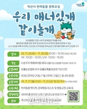 (원투원뉴스) 익산시가 올바른 반려동물 문화 확산을 위한 교육의 장을 연다. 익산시는 오는 29~30일 함열 다송무지개 매화마을에서 '반려동물 문화교실'을 열고, 반려동물 이론 교육과 실습을 진행한다고 13일 밝혔다. 이번 교육은 사람과 동물이 함께 어울리는 사회 분위기를 조성하고, 성숙한 반려동물 인식과 예절 확산을 위해 마련됐다. 참가비는 무료이며, 교육 대상은 동물보호법에 따라 동물등록을 완료한 익산시민이다. 참여를 원하는 경우 익산시 누리집을 통해 온라인으로 신청하면 된다. 신청 기간은 오는 17~21일이며 선착순 80팀(회차당 20팀)을 모집한다. 교육 내용은 반려동물 양육에 필요한 기본상식과 펫티켓 종류, 반려인의 의무 사항 등 이론 강의부터 행동 교정과 훈련법을 익히는 실습까지 다양하게 구성됐다. 특히 1회당 20팀씩 소규모로 진행해 참가자별 1:1 맞춤형 지도가 이뤄진다. 오는 30일에는 유기동물 인식 개선과 입양 문화 확산을 위한 '유기동물 입양 홍보 캠페인'도 함께 진행된다. 더욱 자세한 내용은 축산과로 문의하거나 익산시 누리집 '다이로움 소식'에서 확인하