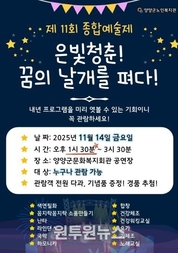 (원투원뉴스) 양양군은 오는 11월 14일 오후 1시 30분 양양군문화복지회관에서 ‘제11회 종합예술제—은빛청춘, 꿈의 날개를 펴다’ 를 개최한다. 이번 행사는 양양군노인복지관 주관으로 400여 명의 어르신들이 1년간 갈고닦은 예술적 기량과 학습 성과를 선보이는 자리로, 기념식, 공연, 작품 전시 등 다채로운 프로그램이 마련됐다. 기념식에서는 각 분야에서 뛰어난 성취를 이룬 ‘프로그램 모범 수강생 20명’에 대한 시상식이 진행된다. 이어지는 무대에서는 △난타 △라인댄스 △국악 △하모니카 △합창 △건강체조 △요가 △기체조 △노래교실 등 어르신들이 직접 준비한 공연이 펼쳐져 관객들에게 감동과 즐거움을 선사할 예정이다. 특히 건강워킹교실과 건강체조 공연은 활기찬 노년의 모습을 생동감 있게 보여주며, 세대 간 소통과 공감을 이끌어낼 것으로 기대된다. 행사장 로비에서는 ‘색연필화’, ‘꼼지락꼼지락 소품만들기’ 등 수강생들의 창작 작품이 전시된다. 섬세한 예술 감각이 담긴 작품들은 관람객들에게 어르신들의 창의성과 열정을 가까이에서 느낄 기회를 제공한다. 김지훈 양양군노인복지관장은 “이번 종합예술제