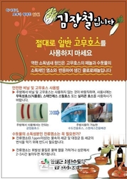 (원투원뉴스) 임실군이 본격적인 김장철을 맞아, 주민들에게 김장배추 세척 시 일반 고무호스(공업용 호스) 사용을 자제할 것을 강력히 당부했다. 이는 고무호스의 유해화학물질과 수돗물의 소독제인 염소가 반응하여 발생하는 클로로페놀이 소독 냄새의 주요 원인이 되며, 인체 건강에도 좋지 않은 영향을 줄 수 있기 때문이다. 식재료 세척을 위해서는 반드시 무독성(식품용) 호스 또는 실리콘 호스를 사용하는 것이 안전하다. 또한 수돗물의 소독성분인 잔류염소는 꼭 필요한 성분으로, 수돗물 속 세균과 대장균의 번식을 방지하기 위한 최소한의 소독제 역할을 한다. 잔류염소는 물을 끓이거나 상온에 2~3시간 정도 두면 자연스럽게 사라진다. 심 민 군수는“김장철마다 주민들이 고무호스로 배추를 씻는 경우가 많지만, 이는 위생상 매우 위험한 습관이다”며“김장철에는 식품용 호스를 사용할 것을 권장드린다”고 말했다.