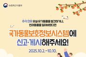 (원투원뉴스) 추석 연휴 유실·유기동물을 발견하거나, 반려동물을 잃어버렸다면 국가동물보호정보시스템에 신고·게시해주세요! ■ 추석 연휴 유실·유기동물 구조 통합 신고시스템 운영으로 신속한 온라인 신고·접수 가능 · 기간: 2025.10.2.(목)~10.10.(금) · 신고 게시: 국가동물보호정보시스템 누리집 팝업창 ■ 유실·유기동물 온라인 신고·접수 방법 ① 유실·유기동물을 발견한 경우 국가동물보호 정보시스템 '동물발견' 배너 클릭 → 발견장소, 사진, 개체 특징 등 제보 등록 → 해당 지자체 보호센터 정보제공 → 지자체 동물보호센터 신속 대응 ② 반려동물을 분실한 경우 국가동물보호 정보시스템 '동물분실' 배너 클릭 → 반려동물 분실장소, 일시, 사진 등 정보 등록 → 시민 간 발견 정보 공유(댓글 창 활성화) → 필요시 분실신고 병행(등록동물 정보 변경) 유실·유기동물 구조 통합신고로 보호자를 빠르게 찾아드리겠습니다