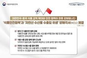 (원투원뉴스) 대한민국-중국 식품 교역 확대와 안전 협력이 한층 강화됩니다. - '식품안전협력'과 '자연산 수산물 수출입 위생' 양해각서(MOU) 체결('26.1.5.) 양국 간 식품안전 협력 강화 식품안전 법률·규정 등 정보 교환, 수입식품 부적합 정보 제공 및 현지실사 협조 등 식품안전 규제 분야 협력 체계 구축 식품 수출 공장 등록 절차 간소화 식약처가 일괄 등록 가능해져 복잡하고 오래 걸리던 절차 부담 완화 자연산 수산물 수출 절차 완화 자연산 수산물 신규 수출 등록 시 위생평가가 제외되어 우수한 K-수산물의 중국 시장 진출 확대 기대 "식약처는 국제 협력을 통해 K-푸드의 글로벌 경쟁력 강화와 수출을 적극 지원하겠습니다."