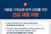 (원투원뉴스) 겨울철 가축질병 방역 강화를 위한 긴급 재정 지원 - 고병원성 조류인플루엔자 방역 강화를 위해 9개 시·도*에 재난안전특교세 30억 원을 지원 *광주, 세종, 경기, 충북, 충남, 전북, 전남, 경북, 경남 - 이번 지원은 고병원성 조류인플루엔자가 지속적으로 발생하는 지역의 소독약품 구입, 거점소독시설 및 이동통제초소 운영 등 보다 강화된 현장 방역활동을 지원하기 위해 결정 - 행안부는 지난해 11월 24일에 14개 시·도에 고병원성 조류인플루엔자 확산 방지를 위한 재난안전특교세 50억 원을 지원했으며 이번까지 포함하면 총 80억 원을 지원