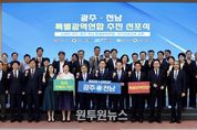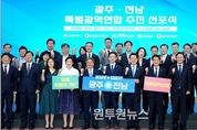 (원투원뉴스) 광주광역시와 전라남도가 국가균형성장을 향한 새로운 출발을 선언했다. 광주시와 전남도는 27일 나주시청 대회의실에서 ‘광주·전남 특별지방자치단체 추진 선포식’을 열고, 공동협약을 했다. 이날 행사에는 강기정 광주시장과 김영록 전남도지사, 신수정 광주시의회 의장, 김태균 전남도의회 의장, 김경수 지방시대위원회 위원장 등이 참석해 상생발전 의지를 밝혔다. 두 시·도는 수도권 집중 심화와 지방소멸 위기라는 국가적 과제에 대응하기 위해 이재명 정부의 ‘5극3특 국가균형성장 전략’에 발맞춰 공동 행정체제를 구축하기로 했다. 협약을 통해 특별지방자치단체(가칭 ‘광주·전남특별광역연합’) 설치에 합의하고, 올 연말까지 특별지방자치단체 출범을 목표로 ‘광주·전남합동추진단’을 구성해 체계적으로 준비할 예정이다. 합동추진단은 특별지방자치단체 운영(조직·재정·연차별 업무계획 등), 초광역 공동사무와 국가이양사무 발굴, 의회 설치, 규약 제정 등 특별지방자치단체 설립을 위한 사전 준비를 전담한다. 특별지방자치단체 공동사무는 산업·교통·관광 등을 대상으로 협의 추진하되, 조속한 출범을