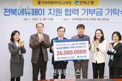 (원투원뉴스) 전북에듀페이카드 운영사인 전북은행이 전북특별자치도교육청에 장학금 2,600만 원을 기부했다. 전북교육청과 전북은행은 25일 본청 5층 회의실에서 전북에듀페이 지원 협력사업 기부금 기탁식을 개최했다. 전북은행은 이날 전북에듀페이카드 바우처 사용액의 0.1%에 해당하는 2,600만 원의 기부금을 학생 복지와 지역사회 공헌의 취지로 기탁했다. 지난해 2,000만 원을 기부한 전북은행은 내년까지 3년 동안 약 6,300만 원을 기부할 계획이다. 전북은행 기부금은 전북특별자치도교육청사랑의장학회를 통해 장학금으로 전달된다. 올해 초중고 학생과 학교 밖 청소년 등 총 16만3,000여 명에게 238억여 원의 전북에듀페이를 지원하기로 한 전북교육청은 이달 24일부터 다음 달 15일까지 집중신청 기간을 운영하고 있다. 김은호 전북은행 부행장은 “전북에듀페이카드 운영사로서 전북에듀페이를 매개로 나눔과 베풂의 학생 교육복지에 동참할 수 있어 뜻깊게 생각한다”고 밝혔다. 한긍수 정책국장은 “전북에듀페이가 단순한 지원금을 넘어 교육과 나눔이 공존하는 선순환 체제를 만들