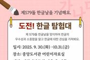 (원투원뉴스) 인천광역시교육청중앙도서관은 제579돌 한글날을 맞아 9월 30일부터 10월 31일까지 어린이들이 즐겁게 한글을 배우고 도서관을 체험할 수 있는 특별행사 ‘도전! 한글 탐험대!’를 운영한다. 이번 행사는 어린이자료실에서 진행하며, 어린이들이 비치된 문제지를 풀며 한글의 독창성과 우수성을 체험할 수 있도록 준비했다. 문제는 어린이 눈높이에 맞춰 쉽고 재미있게 구성했으며, 3문제 이상을 맞히면 소정의 기념품을 받을 수 있다. 자세한 사항은 중앙도서관 누리집 또는 어린이자료실로 문의하면 된다.
