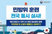 (원투원뉴스) ■ 8월 20일(수) 오후 2시부터 20분간 · 오후 2시, 훈련 공습경보가 발령되면 신속히 대피. · 운전 중 소방차나 앰뷸런스가 보이면 꼭 양보운전. · 오후 2시 15분 경계경보 발령 시 대피소에서 이동 가능. → 오후 2시 20분 경보해제 후 일상활동 복귀. 1. 일상 생활 중에 꼼꼼히 준비하세요! 대피장소 사전에 파악하고, 비상 생존배낭 준비하기 · 민방위 대피소 찾기 ① 민방위 대피소 검색(위치 기능 활성화) - 네이버, 다음, 카카오맵, 네이버지도, 티맵, 안전디딤돌. ② 가까운 대피소 클릭. ③ 길찾기로 위치 확인. · 생존배낭 꾸리기 생수, 간편식, 손전등, 상비약, 방독면, 라디오(건전지), 마스크, 우의 등. 2. 공습경보가 울리면, 안전하게 대피하세요! · 가까운 민방위 대피소로 이동. - 위급시 가장 가까운 지하시설, 지하철역, 건물 지하시설 등. 3. 대피소에서 정부 안내방송을 경청해 주세요! · 정부의 안내에 따라 행동해요. - 라디오 방송 듣기. - 유언비어에 동요하지 않기. · 질서유지, 상호 배려하기.