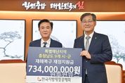 (원투원뉴스) 충남도는 한국지방재정공제회로부터 호우피해 재정지원금 8억원을 전달받았다고 2일 밝혔다. 이번 재정지원금은 7월 16-20일 발생한 집중호우로 특별재난지역으로 선포된 천안시 등 9개 시군에 지원한다. 도는 그동안 도 소유 건물·시설물 등에 대한 공제사업을 담당하고 있는 한국지방재정공제회와 피해복구 지원 방안을 협의해 왔으며, 지난달 8억원 규모의 재정을 지원하기로 결정했다. 김태흠 지사와 정선용 공제회 이사장은 이날 도청 접견실에서 전달식을 갖고, 피해 지역 주민의 신속한 일상회복 등을 위해 지속 협력하기로 했다. 김 지사는 “피해복구를 위해 8억원의 재정지원을 결정한 지방재정공제회에 진심으로 감사하다”며 “도와 공제회 간 상생발전이 계속될 수 있도록 최선을 다하겠다”고 말했다.