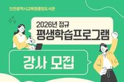 (원투원뉴스) 인천광역시교육청중앙도서관은 지역 주민에게 다양한 학습 기회를 제공하기 위해 ‘2026년 평생학습프로그램’ 강사를 공개 모집한다. 2026년 정규 평생학습프로그램은 상반기(3~5월)와 하반기(9~11월)로 나뉘어 각각 8회씩 운영되며, 모집 분야는 유아 대상 독후활동, 초등 1~2학년 대상 초등 영어, 성인 대상 AI 활용과 동영상 제작, 우쿨렐레, 금융·경제 등 총 5개 분야다. 서류 접수는 12월 23일부터 29일 오후 5시까지이며, 중앙도서관 누리집 공지사항에서 제출 서식을 내려받아 작성한 뒤 관련 서류와 함께 이메일로 제출하면 된다. 강사는 1차 서류심사와 2차 면접심사를 거쳐 최종 선정된다. 자세한 사항은 중앙도서관 누리집에서 확인할 수 있으며, 문의는 마을교육지원과로 하면 된다.