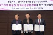 (원투원뉴스) 용인특례시는 19일 시청 접견실에서 한국기계연구원(KIMM), 용인시산업진흥원과 ‘첨단산업 육성 및 반도체 경쟁력 강화를 위한 업무협약’을 체결했다. 이날 협약은 기업 단독으로는 활용이 어려운 국가 연구 인프라를 지역 기업이 활용할 수 있도록 하고자 마련됐다. 협약 내용은 ▲첨단산업 분야 연구개발·상용화 상호 협력 ▲소부장 기업 기술 실증(시험·평가·인증 등)·사업화 지원 추진 ▲첨단산업 분야 정부 기반 구축 사업·연구개발(R&D) 공모사업 유치 협력 ▲한국기계연구원 시설·연구개발 장비 등 활용 사업 ▲첨단기술 활용 맞춤형 R&D 정책 과제 기획·추진 등이다. 협약에 따라 용인지역 기업은 국가 연구기관의 시험·평가 인프라를 활용한 실증화와 사업화 등 실질적 지원을 받을 수 있게 된다. 시는 이번 협약을 계기로 용인에 유치한 한국전자통신연구원, 용인지식재산(IP)지원센터, 인공지능(AI)무역센터와 함께 지·산·학·연 협력 기반을 기업 성과 중심으로 한 단계 끌어올린다는 방침이다. 이상일 시장은 “용인의 반도체산업 경쟁력 강화를 위해 한국기계연구원이 우리 시, 용인시산업진흥원
