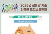 (원투원뉴스) 국토교통부는 2025년 6월말 기준 외국인 토지·주택 보유통계를 공표했다. 2025년 6월말 외국인 보유 토지면적은 268,299천㎡로 2024년 12월 대비 0.15% 증가했으며, 증가율은 직전 대비 0.7%p 감소(0.85→0.15%)했다. 2025년 6월말 외국인 소유 주택수는 10.4만호로 2024년 12월 대비 3.8% 증가(10→10.4만호)했으며, 증가율은 직전 대비 1.6%p 감소(5.4→3.8%)했다. 지난 8월 21일 수도권 일부 지역을 외국인 토지거래허가구역으로 지정한 점을 고려하면 올해 말까지의 증가율은 더욱 감소할 것으로 전망된다. 외국인이 보유한 국내 토지면적은 268,299천㎡로, 전체 국토면적(100,459,874천㎡)의 0.27% 수준이다. 국적별 비중은 미국(53.3%), 중국(8.0%), 유럽(7.1%) 등으로 나타났고, 지역별로는 경기(18.5%), 전남(14.7%), 경북(13.5%) 등으로 나타났다. 용도별 비중은 기타(67.7%), 공장용(22.0%), 주거용(4.3%)등으로 나타났고, 주체별로는 외국국적교포(55.4%
