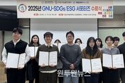 (원투원뉴스) 경상국립대학교 지속가능발전센터는 2월 11일 칠암캠퍼스에서 ‘2025년 GNU-SDGs/ESG 서포터즈 수료식’을 개최했다. 이날 수료식은 지속가능발전센터 소속 직원들이 참석한 가운데 센터장 인사말을 시작으로 수료증 수여 순으로 진행됐다. 참석자들은 한 해 동안 적극적으로 활동한 서포터즈 학생들의 노고를 격려하고 활동 성과를 공유했다. ‘GNU-SDGs/ESG 서포터즈’는 재학생이 직접 프로그램을 기획·운영하고 성과를 환류하는 학생 주도형 활동으로, 교내외 SDGs(지속가능발전목표) 및 ESG 가치 확산과 실천 문화 정착을 목적으로 운영되고 있다. 2025년 제4기 GNU-SDGs/ESG 서포터즈는 지난 5월 발대식을 시작으로 ▲대동제 SDGs 체험부스 ▲분리수GO! 캠페인 부스 ▲공정무역 인식 제고 캠페인 부스 등 다양한 프로그램을 기획·운영하며 학내 구성원의 참여를 이끌어 냈다. 이로써 일상 속 실천을 기반으로 한 지속가능성 인식 확산에 기여했다. 김영철 경상국립대학교 지속가능발전센터장은 “GNU-SDGs/ESG 서포터즈는 학생들이 주체가 되어 지속가능성과 ESG 가치