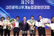 (원투원뉴스) 이장우 대전시장이 19일 대전시 농업기술센터에서 열린 제29회 한국후계농업경영인 대전시대회 개회식에서 대전 농업 발전에 기여한 공로로 한국후계농업경영인 대전시연합회로부터 감사패를 받았다. 이번 행사는 ㈔한국후계농업경영인 대전시연합회 주최로 열렸으며, 대전지역 농업인과 농협 관계자, 도시민 등 300여 명이 참석해 농업의 미래를 함께 논의하는 자리가 됐다. 이장우 대전시장은 수상 소감에서 “농업은 국가의 근간 산업으로 식량 안보와 생태계 보전에 중요한 역할을 하고 있다”라며 “과학수도 대전에 걸맞은 첨단기술을 활용해 스마트농업 기반을 조성하고 미래 농업의 성장 동력을 확보하는 데 최선을 다하겠다”라고 말했다.