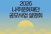 (원투원뉴스) 나주문화재단이 2026년도에 추진할 문화사업 전반을 시민과 공유하고 공모 참여 기회를 확대하기 위해 설명회를 개최한다. 나주문화재단은 오는 2월 24일 나빌레라문화센터 소극장에서 ‘2026년 나주문화재단 통합 공모사업설명회’를 연다고 13일 밝혔다. 이번 설명회는 지역민과 예술인을 대상으로 재단의 연중 사업을 종합적으로 안내하고 공모사업 참여를 독려하기 위해 마련했다. 재단은 2026년 추진 예정 사업 전반과 함께 총 5건의 공모사업 개요, 신청 방법, 서식 작성 요령 등을 상세히 설명할 계획이다. 설명 대상 사업은 나주형 커뮤니티 발굴사업 ‘취향살롱’, 지역문화 활성화 지원사업, 나빌레라문화센터 전시공간 지원 공모, 나빌레라문화센터 창작실 입주작가 공모, 미디어 콘텐츠 촬영 장소 지원 등 5건이다. 설명회에서는 사업 안내와 더불어 현장 질의응답 시간을 운영해 시민과 예술인의 이해도를 높이고 다양한 의견을 수렴할 예정이다. 이를 통해 재단과 지역 문화 주체 간 소통을 강화하고 정책 반영의 기반을 마련한다는 방침이다. 특히 직장인 등 다양한 계층의