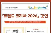 (원투원뉴스) 인천광역시교육청서구도서관은 11월 26일 오후 7시부터 9시까지 『트렌드 코리아 2026』의 공동 저자 전다현 연구원을 초청해 ‘미리 내다보는 2026 전망’ 강연을 진행한다. 이번 강연은 서구도서관의 대표 인문학 프로그램인 '수요인문학'의 일환으로, 함께읽기 프로그램과 연계해 온라인(ZOOM)으로 운영된다. 서울대 소비트렌드분석센터 전다현 연구원이 ‘HORSE POWER’를 핵심 키워드로 인공지능(AI) 대전환 시대의 변화와 대응 전략을 이야기할 예정이다. 참가 신청은 11월 12일 오전 10시부터 서구도서관 누리집에서 가능하며, 자세한 사항은 독서문화과로 문의하면 된다.