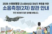 (원투원뉴스) 수원특례시가 수원비행장 인근 주민들의 소음 피해 보상 근거가 될 국방부의 ‘수원비행장 소음 영향도 조사 2차 소음측정’ 주민 참관 참여자를 모집한다. 4월 28일까지 새빛톡톡으로 신청할 수 있다. 소음측정은 4월 30일부터 5월 8일까지 24시간 연속 측정 방식으로 진행된다. 측정 과정의 공정성과 투명성을 높이기 위해 시민이 참관할 수 있도록 했다. 대상 지점은 ▲서평초(서둔동) ▲평화주택(평동) ▲탑동초(탑동) ▲거산아파트(금곡동) ▲고색초(고색동) ▲수원아이파크6단지(권선2동) 등이다. 1차 소음측정(지난해 8월) 대상지와 동일하다. 소음측정은 ‘군용비행장·군사격장 소음 방지 및 피해 보상에 관한 법률’에 따라 진행되며, 군용비행장 소음 영향도 조사 예규를 따른다. 지난해 8월 이뤄진 1차 측정 결과와 이번 2차 결과는 분석·검증을 거쳐 올해 말 국방부에서 소음대책지역을 지정·고시할 때 활용될 예정이다. 수원시 관계자는 “소음 영향도 조사는 주민 보상과 직결되는 중요한 절차인 만큼 시민 참여로 신뢰도를 높일 것”이라며 “관심 있는 시민들이 적극적으로 참여해 주길 바란다
