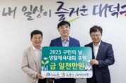 (원투원뉴스) 대전 대덕구는 하나은행 충청영업그룹으로부터 ‘2025년 구민의 날’과 ‘대덕구민 체육대회’를 위한 후원금 1000만원을 기탁받았다고 15일 밝혔다. 구는 전달받은 성금을 오는 27일에 개최 예정인 ‘2025년 구민의날’ 과 11월 ‘대덕구민 체육대회’의 운영을 위해 사용할 계획이다. 이동열 하나은행 충청영업그룹 부행장은 “대덕구민이 함께 즐길 수 있는 뜻깊은 행사에 동참하게 돼 기쁘다”며 “앞으로도 지역사회와의 동반 성장을 위해 긴밀한 협력을 이어가겠다”고 전했다. 박종길 대덕구체육회장은 “대덕구민 화합의 장이 될 대회를 준비하는 데 하나은행 충청영업그룹의 후원이 큰 도움이 될 것”이라고 밝혔다. 최충규 대덕구청장은 “하나은행의 후원으로 대덕구민의 날과 대덕구민 체육대회 두 행사가 더욱 풍성하고 의미 있게 치러질 것”이라며 “앞으로도 구민 모두가 즐길 수 있는 화합의 장을 만들어 가는 데 최선을 다하겠다”고 말했다.