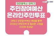(원투원뉴스) 대전 대덕구는 오는 22~30일 2026년 주민참여예산 사업 선정을 위한 온라인 주민투표를 진행한다고 16일 밝혔다. 올해 투표 대상은 온라인 접수와 동별 지역회의를 거쳐 우선순위로 선정된 안건 가운데 소관 부서 적격 검토를 통과한 28개 사업이다. 대덕구 거주민은 물론 대덕구 소재 직장인·학생 모두 투표에 참여할 수 있으며, 대덕구 주민참여예산제 홈페이지에 로그인해 본인인증을 마친 뒤, 관심 사업 최대 3개를 선택해 투표하면 된다. 최종 결과는 주민투표 점수와 ‘예산참여 구민위원회’ 서면심사를 합산해 고득점순으로 확정, 내년도 예산(총 2억 4000만원)에 반영된다. 최충규 대덕구청장은 “주민참여예산제는 구민 참여로 완성되는 제도”라며 “많은 주민이 투표에 동참해 대덕구에 꼭 필요한 사업을 직접 선택해 주시길 바란다”고 말했다. 한편, 대덕구는 주민참여예산 사업선정을 위해 자체 홈페이지를 통한 온라인 사업제안, 투표 절차를 진행해 오고 있다.