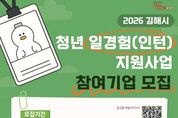(원투원뉴스) 김해시는 미취업 청년에게 기업 직무 경험 기회를 제공하는 청년 일경험(인턴) 지원사업 참여기업을 모집한다고 1일 밝혔다. 청년 일경험 지원사업은 청년에게 실무 중심의 직무 경험과 채용 연계 기회를 제공, 기업에는 맞춤형 인재 발굴·육성을 지원하기 위해 올해로 2년째 시행하고 있다. 지난해는 19개 기업에서 청년 24명이 3개월간 일경험(인턴) 프로그램에 참여했으며, 참여자의 과반이 정직원으로 전환되는 성과를 거두며 실질적인 채용 연계 효과를 입증했다. 올해 모집 대상은 김해시 소재 구인 계획이 있는 상시근로자 3명 이상인 기업 25개사다. 선정된 기업이 청년 채용까지 완료할 경우, 청년 일경험 수당(월 150만원/인)과 기업 멘토 수당(월 5만원/인) 3개월분을 지원한다. 참여기업 모집 기간은 오는 14일까지이며, 신청을 희망하는 기업은 김해시청 인구청년정책관을 방문하거나 이메일 또는 팩스로 접수하면 된다. 자세한 사항은 김해시청 누리집 공고문에서 확인할 수 있다. 우미연 김해시 인구청년정책관은 “기업의 채용 트렌드가 경력 중심으로 변화하면서 일경험의 필요