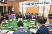 (원투원뉴스) 울주군의회 최길영 의장은 15일 의장실에서 웅촌면 주민대표들과 간담회를 갖고, 지역의 주요 현안에 대한 의견을 청취했다. 이상걸 경제건설위원장과 김상용 의원이 함께한 이날 간담회에는 웅촌면 이장협의회, 주민자치위원회, 지역사회보장협의체, 새마을협의회, 여성단체협의회, 체육회 등 웅촌면을 대표하는 6개 단체의 장들이 참석한 가운데 진행됐다. 참석자들은 회야강 상류지역이라는 지리적 특성으로 인한 각종 개발 제한으로 재산권 행사에 큰 제약이 따르고, 지역 발전이 장기간 지체되고 있다는 점을 강조했다. 특히 괴천삼거리~춘해보건대 도로확장, 대대·검단 도시계획도로 등 추진 중인 8개 도로사업 대부분이 착공 지연상태에 있다는 점을 언급하며, 조속한 착공을 위한 협조를 요청했다. 회야지구·대복지구 지방하천 정비사업의 장기화에 대한 우려 문제도 거론됐다. 이들 사업은 각각 2017년, 2020년 시작됐지만, 사업 진척이 미비해 주민 불안과 불만이 가중되고 있는 실정이다. 참석자들은 단순 재해 예방을 넘어, 지역 친수공간으로의 활용 가능성까지 고려한 조속한 사업 추진을 요구했다. &nbs