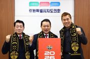(원투원뉴스) 강원특별자치도의회는 2026년 강원FC의 선전과 도내 축구 열기 확산을 위해 ‘시즌권 구매-기부 릴레이’에 동참한다. 강원특별자치도의회 의장 김시성과 김병지 강원FC 대표이사는 1월 14일 도의회 의장 집무실에서 강원FC 시즌권 구매-기부 릴레이를 진행했다. 이번 릴레이를 통해 강원특별자치도의회 명의로 기부된 시즌권은 평소 프로축구를 접하기 어려운 아동과 청소년에게 전달되어 도민 화합과 축구 저변확대에 기여할 것으로 기대된다. 도의회 김시성 의장은 “올 한해도 강원FC가 한 단계 더 도약하고 성장할수 있도록 지속적인 관심을 기울이겠다”며, “강원FC가 도민들에게 화합과 행복을 주는 구단으로 발전하기를 응원한다”고 말했다.