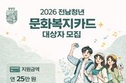 (원투원뉴스) 담양군은 관내 청년을 대상으로 문화생활 향유 및 자기 계발 기회를 제공하고자 전남청년 문화복지카드 지원사업을 추진한다고 9일 밝혔다. 주소지 읍·면 사무소 방문 신청은 2월 9일부터 3월 31일까지, 농협카드 누리집 신청은 2월 20일부터 3월 31일까지 가능하며 기존 수혜자도 반드시 다시 신청해야 한다. 다만 공공기관 근무자, 학교 밖 청소년 수당 대상자, 여성농업인 행복바우처 대상자는 제외되며, 문화누리카드 수혜자는 중복 지원을 받을 수 있다. 2024년 2월 9일 이전부터 도내 거주한 19~28세 청년을 대상으로 하며, 연 25만 원의 문화복지비가 지원된다. 지원금은 문화·공연 관람, 학원 수강, 도서 구입 등 문화·여가 및 자기 계발 분야에서 사용할 수 있으며, 전남 도내에서 올해 안에 모두 사용해야 한다. 군 관계자는 “전남청년 문화복지카드 지원사업을 통해 청년들의 문화 참여 기회를 넓히고 삶의 질을 높이는 계기가 되길 바란다”라며 “앞으로도 청년의 수요를 반영한 문화·복지 정책을 추진해 청년이 머물고 성장할 수 있는 담양을 만들어 가겠다”라고 말했다.