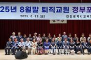 (원투원뉴스) 대전시교육청은 8월 29일 11시 본관 대강당에서 퇴직교원 정부포상 대상자와 가족 및 교육청 관계자 등이 참석한 가운데 2025년 8월말 퇴직교원 정부포상 전수식을 개최했다고 밝혔다. 포상 수상자들은 오랜 세월 교직에 몸담아 오면서 재직 중 공 ․ 사생활에 흠결없이 퇴직하는 교육자로서 대전 교육발전 및 국가 교육발전에 기여한 공적을 인정받아 수상하게 됐다. 훈격별로는 황조근정훈장 10명, 홍조근정훈장 23명, 녹조근정훈장 20명, 옥조근정훈장 41명, 근정포장 18명, 대통령표창 5명, 국무총리표창 3명, 부총리 겸 교육부 장관 표창 11명으로 총 131명이다. 퇴직교원을 대표해 단상에 선 충남여자고등학교 김종윤 교장은 교직생활을 함께 해준 동료 교육 가족들에 대한 감사 인사와 함께 퇴임 소회를 밝혔다. 설동호 교육감은 “교육에 대한 사랑과 열정으로 국가와 대전교육 발전을 위해 헌신한 선생님들께 존경과 축하의 마음을 전한다”며 “대전교육가족은 언제나 선생님들을 기억하고 응원할 것”이라고 전했다.