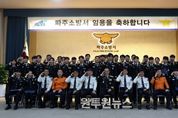 (원투원뉴스) 파주소방서는 오는 12일 오전, 본서 3층 대회의실에서 타 소방서에서 전입한 소방공무원 41명에 대한 임용신고식을 열었다. 화재, 구조, 구급, 행정 등 다양한 분야에서 새롭게 합류한 전입자들은 이날 임용장을 받고, 파주소방서의 가족으로 첫 발을 내디뎠다. 임용식은 서장 주관의 임용장 수여를 시작으로, 보안 및 보건관리 교육, 조직문화 안내 등으로 진행됐다. 각자의 위치는 달라도 ‘시민의 안전’을 향한 마음은 하나라는 것을 나누는 뜻깊은 시간이었다. 김명찬 파주소방서장은 “이제 여러분은 파주소방서라는 하나의 이름 아래 함께 걷는 동료”라며 ““소방공무원으로서의 긍지와 사명을 가슴에 새기고, 시민의 생명을 지키는 길에 함께하길 바란다”고 전했다. 전입자들은 앞으로 파주소방서의 일원으로서, 각자의 위치에서 사명감과 책임감을 갖고 시민의 생명과 안전을 지키는 데 힘을 보탤 예정이다.