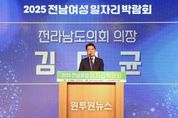 (원투원뉴스) 김태균 전라남도의회 의장은 9월 19일 목포 신안비치호텔에서 개최된 ‘2025년 제3회 전남 여성 일자리 박람회’에 참석하여 축사와 함께 여성 구직자들을 격려․응원했다. 이날 박람회에는 김영록 지사와 전남도의회 도의원, 기업, 여성단체 회원, 구직자 등 1,000여 명이 참석한 가운데 개회선언에 이어, 퍼포먼스, 기념촬영, 행사장 순회 순으로 진행됐다. 김태균 의장은 축사를 통해 “우리 전라남도의회는 특히 여성일자리에 대해 많은 정책개발과 관심을 갖고 있다”면서 “전남은 여성에 대한 일자리와 청년 일자리가 제일 시급하여 부족한 일자리를 많이 만들어야 한다”고 강조했다. 이어, “여성은 출산을 하고 나면 휴직을 하고 퇴사를 하게 되면 경력단절이 생겨 임금과 고용에서 차별을 받게 된다”며 “여성들의 경력단절에 대한 일자리 마련을 위해 전라남도의회에서도 좋은 정책으로 전라남도를 뒷받침하고 여성의 고용 현실 개선을 위해 최선을 다 하겠다”고 밝혔다. 한편, 이번 박람회에는 목포, 나주, 해남 등 12개 시군에서 참여했고 현장면접관, 창업체험관, 취업컨설팅관 등 부스 70개를 운영하며 구인․구
