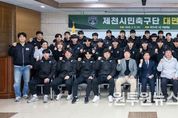 (원투원뉴스) 제천시민축구단 선수단과 구단주의 공식 대면식이 지난 11일 제천시청에서 열렸다. 오는 24일 창단식을 앞두고 열린 이번 대면식에는, 구단주인 김창규 제천시장과 김용기 단장, 선수단 등 관계자들이 참석했다. 선수와 코치진 구성을 마친 제천시민축구단은 구단주와 공식적으로 첫인사를 나누고, 팀의 운영 방향과 시즌 목표를 공유했다. 대면식은 선수단과 코치진 소개, 이번 시즌 운영 계획과 목표 발표, 질의응답 순으로 진행됐다. 김창규 제천시장은 인사말을 통해 선수단을 격려하며, “제천시를 대표하는 시민구단으로서 책임감을 가지고 모든 경기에 최선을 다해달라”고 당부했다. 김용기 단장은 구단 운영 방침과 비전을 소개하며, “제천시와의 협력을 바탕으로 투명하고 신뢰받는 구단을 만들어가겠다”라고 의지를 밝혔다. 한상구 감독은 “2026시즌 목표로 K4리그 상위권 진입과 리그컵 및 코리아컵 3라운드 이상 진출, 충청북도 대표 선발전 승리를 통한 전국체전 우승에 도전하겠다”라며 각오를 밝혔다. 공격수 손주원 선수는 개인 목표를 밝히며, “매 경기 공격 포인트를 기록해 팀에 기여하겠다”라며 포