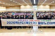 (원투원뉴스) (사)대한노인회 밀양시지회(지회장 신준철)는 11일, 밀양시청 대강당에서 입학생 410명과 내빈들이 참석한 가운데 ‘제21기 밀양노인대학 입학식’을 성황리에 개최했다. 이날 행사는 식전 공연을 시작으로 국민의례, 입학 허가, 입학생 선서, 환영사와 축사 순으로 진행됐으며, 배움에 대한 뜨거운 열정으로 새로운 출발선에 선 어르신들을 축하하는 뜻깊은 자리로 마련됐다. 제21기 밀양노인대학은 3월부터 11월까지 9개월간 운영된다. 매월 둘째· 넷째 주 수요일(월 2회)마다 △교양강좌 △건강강좌 △웃음치료·노래교실 등 오락강좌 △현장학습 등 4개 분야의 다양한 프로그램을 통해 어르신들의 건전한 여가 선용과 평생학습 기회를 제공할 예정이다. 특히 올해는 수강생 모집을 시작한 지 단 2일 만에 정원 410명이 조기 마감될 정도로 어르신들의 높은 관심을 끌었다. 이는 배움에 대한 어르신들의 열정과 밀양노인대학의 내실 있는 운영 성과가 맞물린 결과로 풀이된다. 신준철 지회장은 “제21기 입학생 여러분의 새로운 출발을 진심으로 축하드린다”며 “시대 변화에 맞는 알찬 프로그램을 준비해 어르신들께서 즐겁