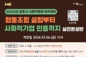 (원투원뉴스) 김포시가 사회문제 해결을 위한 참신한 아이디어와 실행력을 갖춘 사회적경제기업 육성을 위해 ‘2026년 김포시 사회적경제 아카데미’를 개설하고, 오는 3월 3일까지 수강생을 모집한다. 이번 아카데미는 평소 사회적경제에 관심 있는 김포시민은 물론, 연내 협동조합 설립과 사회적기업 인증을 준비 중인 관내 기업, 단체라면 누구나 신청할 수 있다. 교육 과정은 ▲사회적기업 개념 및 인·지정 요건 ▲협동조합 개념, 설립 절차 및 인가 요건 ▲2026년 지원제도 등 사회적경제에 대한 기본 개념을 습득하고, 연내 진입을 위한 사전 준비가 가능하도록 실전형으로 구성했다. 특히 전문가 1:1 멘토링을 통해 ▲사업 아이템의 경쟁력 및 지속가능성 진단 ▲정관, 사업계획서 등 필수서류 작성 ▲심사 및 현장실사 대비 전략 등 기업 맞춤형 컨설팅이 후속으로 지원될 예정이다. 수강신청은 3월 3일까지 온라인으로 가능하며, 자세한 사항은 김포시청 홈페이지를 참조하거나 김포시청 지역경제과로 문의하면 된다. 김포시는 ‘일자리창출을 위한 재정지원’을 비롯해 ‘전략모델 개발비’, ‘교육·컨설팅’, ‘공공·민간