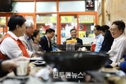 (원투원뉴스) 추석연휴 첫날인 3일 김동연 경기도지사가 파주 문산자유시장을 찾아 통큰세일 지원 확대와 문산자유시장-DMZ 지역 평화 관광 홍보 강화를 약속했다. 이번 방문은 민족 대명절을 앞두고 도민 장바구니 물가를 안정시키고, 경기침체로 어려움을 겪는 소상공인과 전통시장 상인들에게 힘을 보태기 위한 차원에서 마련됐다. 김동연 지사는 지역 상인들과 오찬 간담회를 갖고 경기침체와 소비 위축 등으로 어려움을 겪고 있는 현장의 목소리를 직접 들었다. 상인들은 경기 살리기 통큰세일 행사 시 전통시장 상권별 지원액 상향과 문산자유시장-DMZ 지역 평화 관광 홍보를 요청했다. 이에 김동연 지사는 “경기도는 9월 추경을 통해 20억 원을 추가 확보, 하반기 총 52억 원 규모로 통큰세일을 진행할 예정”이라며 “통큰세일 기간 많은 도민께서 전통시장을 찾을 수 있도록 다각적이고 전방위적인 홍보를 실시하겠다”고 말했다. 이어 “경기관광공사를 통해 문산자유시장-DMZ 지역 평화 관광 홍보를 확대하고 디엠지 오픈(DMZ OPEN) 스포츠 행사와 캠프그리브스, 도라산 평화공원 안내소 등에 홍보물을 비치하도록