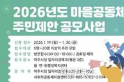 (원투원뉴스) 여주시가 2026년 마을공동체 주민제안 공모사업 관련하여 사업설명회를 개최한다. 이번 설명회는 공모사업에 대한 주민들의 이해를 높이고, 공모사업 참여를 희망하는 공동체가 보다 원활하게 공모를 준비할 수 있도록 마련했다. 사업설명회는 2026년 1월 19일 14시 여주시 사회적공동체지원센터(여주시 세종로14번길 18, 중앙프라자 5층) 소회의실에서 진행된다. 2026년 여주시 마을공동체 주민제안 공모사업 참여를 희망하는 신청예정자 참석 가능하며, 주요 내용으로는 ▲ 경기도 마을공동체 이해교육(동영상 시청) ▲ 2025년 여주시 마을공동체사업 성과보고 ▲ 2026년 여주시 마을공동체 주민제안공모사업 설명 ▲ 질의응답 등이 포함된다.