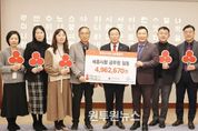 (원투원뉴스) 세종사회복지공동모금회에 따르면 14일 14시30분 세종시청 5층 세종실에서 최민호 세종시장, 박상혁 세종모금회장, 김윤회 세종모금회 부회장 등이 참석한 가운데 ‘희망2026나눔캠페인 희망성금 전달식’을 가졌다. 이날 주식회사 장남에서는 이은영 세종시주민생계조합장, 임헌경 ㈜장남 대표, 홍석하 본부장, 임재덕 상무가 참석한 가운데 ‘희망성금 2천만원 전달식’을 가졌다. 임헌경 장남 대표는 “지난해 경기가 어려워 이웃돕기 성금모금에 참여를 못해 미안한 마음이 많았는데 올해는 다른 예산을 줄여서라도 세종시 어려운 이웃을 위해 동참하게 되어 매우 기쁘게 생각한다”며 “세종시 원주민의 향토기업인 만큼 지역사회와 상생하는 기업으로 성장해 나갈 수 있도록 노력하겠다”고 말했다. 이어 KCC글라스는 김선덕 세종공장장과 정다운 과장이 참석한 가운데 ‘희망성금 2천만원’을 전달했다. 김선덕 세종공장장은 “지난해에 이어 올해도 세종시 어려운 이웃들과 함께 할 수 있어 매우 기쁘게 생각한다”며 “지역과의 상생과 앞으로 다양한 사회공헌 활동에도 앞장서는 기업이 될 수 있도록 노력하겠다”고 말했다.