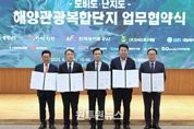 (원투원뉴스) 당진시가 도비도와 난지도 일대 해양관관복합단지 조성에 본격 박차를 가한다. 시는 9월 24일 충남도청 대회의실에서 오성환 당진시장, 김태흠 도지사, 김인중 한국농어촌공사사장, 인장환 ㈜도비도특구개발 대표이사, 김호석 대일레저개발(주) 회장이 참석한 가운데‘도비도-난지도 해양관광복합단지 조성 업무협약’을 체결했다고 밝혔다. 이번 협약은 도비도-난지도 해양관광복합단지 조성 사업의 성공적인 추진과 이를 위한 각 기관의 역할을 공고히 하기 위해 마련된 것으로, 각 기관과 기업은 특구 지정 및 관광사업 조성을 위해 적극 협력할 것을 약속했다. 시는 이번 협약을 통해 해양 치유 콘텐츠 특구와 난지도 해양레저타운을 조성함으로써 경제적 파급효과와 고용창출 효과를 거두고, 서해안 랜드마크와 관광벨트의 초석이 될 것으로 보고 있다. 오성환 당진시장은 “지난 1년 7개월의 시간 동안 민간제안자 선정과 중앙부처, 충청남도, 한국농어촌공사와 지속적으로 업무협의를 하며 열심히 달려왔다”며 “서해안의 대표 명소로 거듭날 수 있도록 시민들과 끊임없이 소통하며 모두가 만족할 수 있는 해양관광복합단지를 만들겠다”고
