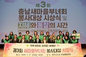 (원투원뉴스) 김태흠 충남도지사는 27일 도청 문예회관에서 열린 제3회 충남새마을부녀회 봉사대상 시상식에 참석, 지역사회를 위해 헌신해온 부녀회장들을 격려했다. 충남새마을회와 충남새마을부녀회가 주최·주관한 이번 행사에는 김 지사와 정광섭 도의회 부의장, 강승규 국회의원, 김정임 새마을부녀회 중앙연합회장, 박숙희 충남새마을부녀회장, 시군 새마을부녀회장 등 800여 명이 참석했다. 행사는 표창 수여, 우수사례 발표, 약속문 낭독, 기념촬영 등의 순으로 진행했다. 표창 수여에서 대상은 천영옥 논산시 채운면 새마을부녀회장이 받았다. 천 회장은 2015년부터 11년 동안 채운면 새마을부녀회장을 역임하며, 독거노인 480세대에 밑반찬을 제공하고, 부녀회원과 독거노인 간 1대 1 결연을 통해 청소와 빨래 봉사 등을 꾸준히 이어올 수 있도록 이끌어온 공로를 인정받으며 이번 영예를 안았다. 채운면 부녀회는 또 매년 120세대에 김장김치와 연탄을 지원하고, 11년 동안 헌옷을 수거·판매해 수익금 전액을 취약계층에 기부하는 등 공동체 봉사에 헌신해왔다. 우수상은 송미경 홍성군 은하면 새마