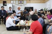 (원투원뉴스) 김동연 지사가 탑승한 ‘달달버스’가 TOK 평택 포승공장 착공식을 마치고 달려간 곳은 포승읍 내기1리 무더위 쉼터. 1층 거실에 어르신 30여 명이 김동연 지사를 맞이했다. 김 지사가 쉼터에 들어서자, 포승읍장이 김 지사는 기다란 역 ㄱ자(') 형태의 소파 중앙에, 어르신들은 소파 앞 바닥에 앉길 권했다. 이 경우 소파 위에서 어르신들을 내려다보며 대화해야 한다. 김동연 지사가 황급히 손사래를 쳤다. “아니에요. 어르신들 무릎도 안 좋으신데, 어르신들이 소파 위에 앉으시는게 편하세요.” 읍장이 “그러면 말씀 나누기가 멀어서...”라고 머뭇거리자 김 지사가 말했다. “제가 가까이 다가가 앉으면 되죠.” 김 지사는 쉼터 내 구석에 멀찍이 있던 테이블을 직접 양손으로 끌어 소파 앞으로 옮겨놓았다. 그리곤 테이블 주변 바닥에 철퍼덕 주저 앉았다. 그제야 어르신들이 옹기종기 소파에 둘러앉았다. 그렇게 김 지사는 어르신들을 올려다보면서 눈높이를 맞추고 대화를 시작했다. 이날 김 지사의 강행군을 거의 모두 함께한 정장선 평택시장이 “오늘 제일 먼저 민생 시찰을 평택으로 오