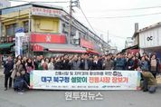 (원투원뉴스) 대구 북구청은 민족 고유 명절인 설을 앞두고 2월 11일 15시부터 동대구시장 및 동대구신시장 일원에서 구청장과 간부 공무원 등 50여 명이 참여하여 장보기 행사를 개최했다. 이번 행사는 온라인 쇼핑몰 이용 급증과 대형 유통업체 확산으로 어려움을 겪고 있는 전통시장에 활력을 불어넣고, 지역 상권 활성화에 동참하기 위해 마련됐다. 북구청은 매년 명절마다 꾸준히 장보기 행사를 이어오며 전통시장 살리기에 앞장서고 있다. 이날 장보기 행사에는 배광식 북구청장을 비롯한 구청 실·과장 이상 간부 공무원과 참여 희망 직원 등 50여 명이 자율적으로 참여해 전통시장 곳곳을 돌며 제수용품과 다양한 먹거리를 구매했다. 또한 각 상인과는 전통시장의 상황 등을 소통하고, 시장을 찾는 주민들에게는 온누리상품권 이용 안내와 시장 홍보 활동도 병행했다. 배광식 북구청장은 “설을 맞이하여 물가 상승과 경기침체로 어려움을 겪고 있는 전통시장에 활력을 불어넣고 상인들에게 조금이라도 도움이 되고자 장보기 행사를 마련했다”라며, “이번 행사를 계기로 더 많은 주민이 전통시장을 이용하고, 설 연휴 동안 가족들과 즐거운 명절을 보내시길
